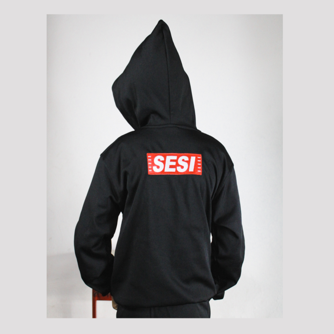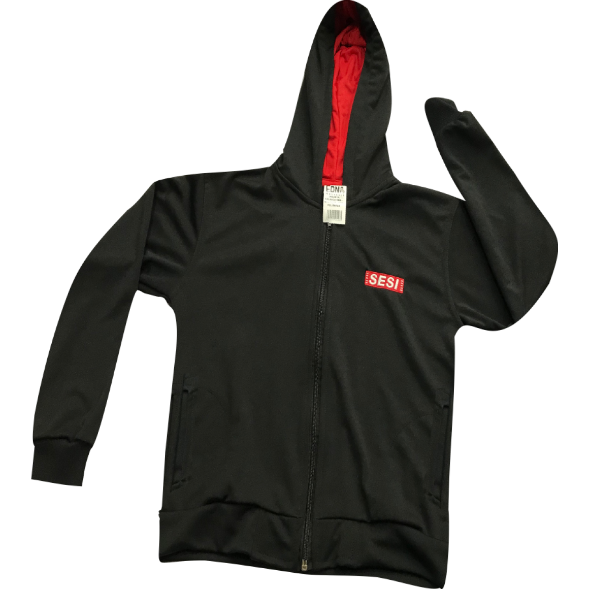 Jaqueta Helanca SESI Infantil, 100% Poliéster. Cor Preta com Bolso lateral e Capuz.